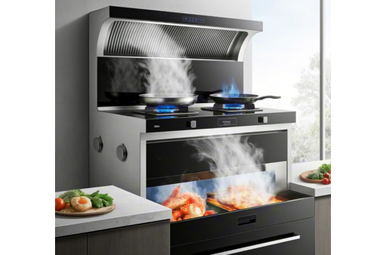 2.攏煙結構設計:風量相同的情況下,“深V型集煙腔”比“平板型”吸凈率高12%。例如某款集成灶采用110°黃金攏煙角,配合下置式風機,形成“漏斗效應”,使油煙在上升過程中自然聚集,減少逃逸。