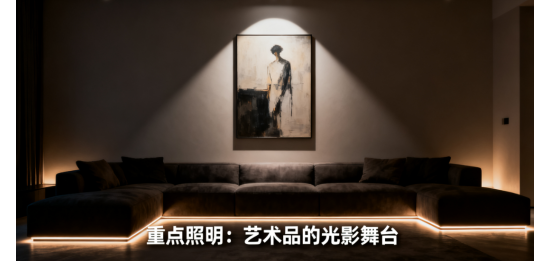 一級(jí)焦點(diǎn)(核心視覺(jué)):客廳藝術(shù)掛畫(huà)(7W射燈,4000K,CRI97顯色指數(shù))、主臥床頭背景墻(RGBW燈帶,支持色溫與色彩自定義);