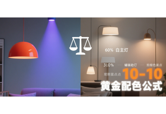 所謂60%黃金配色公式,就是在整體照明色彩搭配中,主色調(diào)占60%,輔助色調(diào)占30%,點(diǎn)綴色調(diào)占10%。這種比例的分配是基于人的視覺審美習(xí)慣和色彩心理學(xué)原理。主色調(diào)是整個(gè)空間照明的基礎(chǔ),它能夠營(yíng)造出空間的整體氛圍;輔助色調(diào)起到補(bǔ)充和豐富主色調(diào)的作用,使空間更具層次感;點(diǎn)綴色調(diào)則是為了增添亮點(diǎn)和個(gè)性,讓空間更加生動(dòng)有趣。